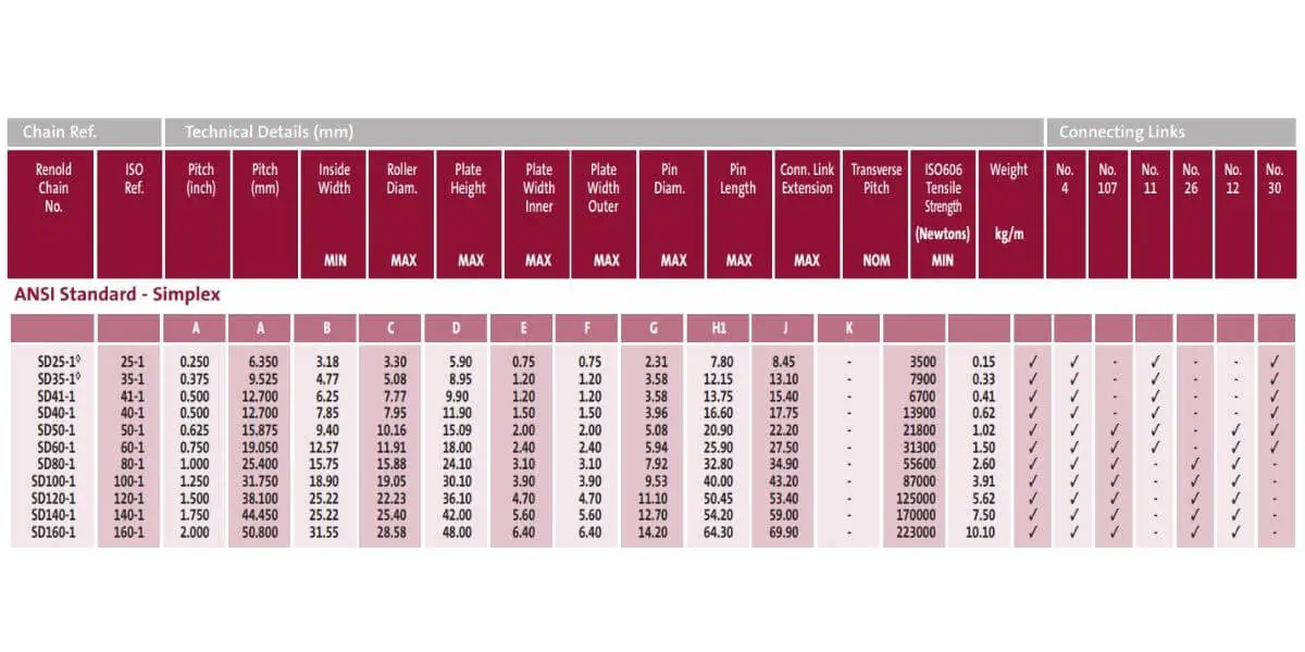 Renold SD Standard Duty galova veriga z ojačanimi lamelami, ki garantira dolgo življensko dobo.